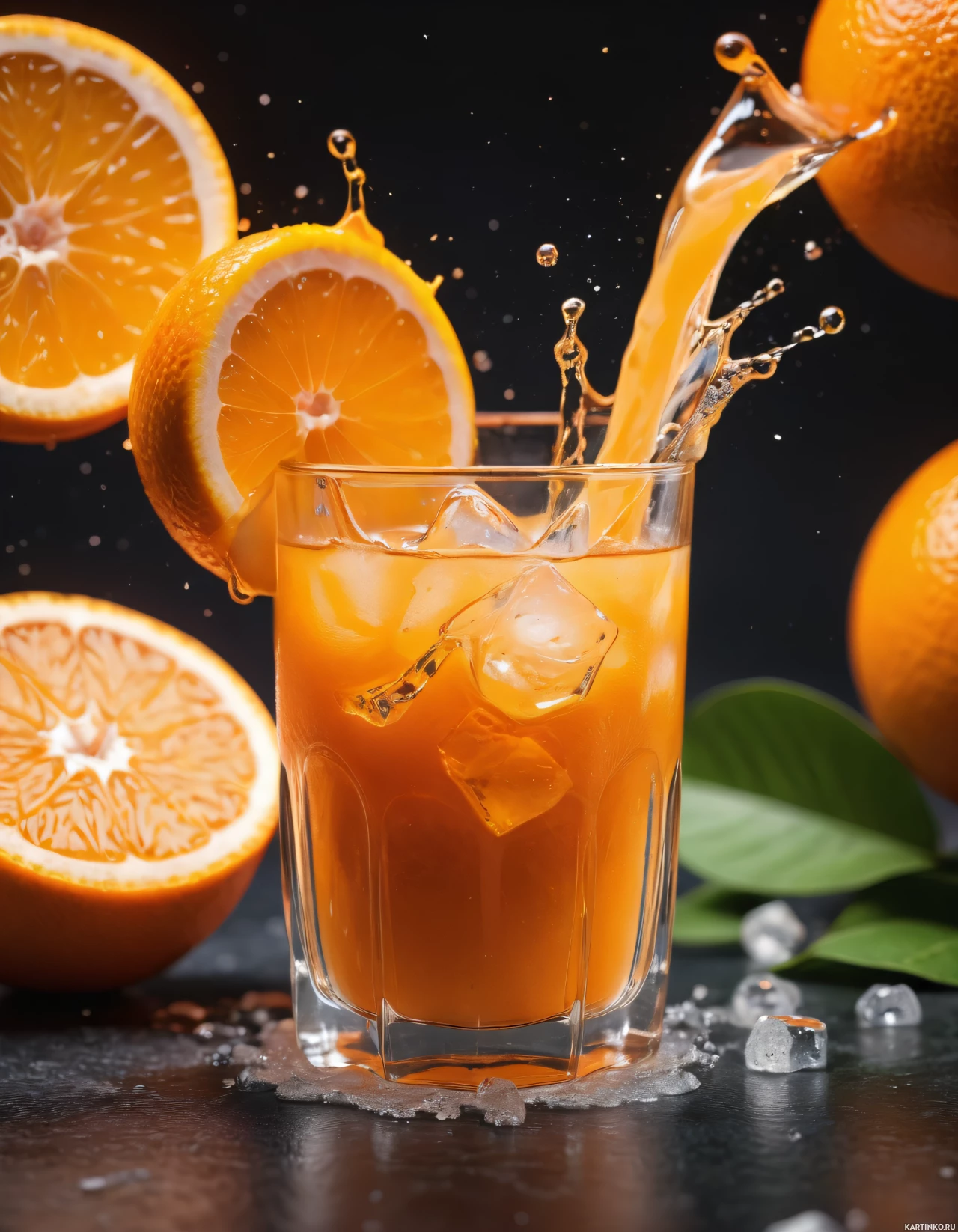 an orange juice served in a glass, with ice cubes floating within the drink. Behind the glass, there are multiple