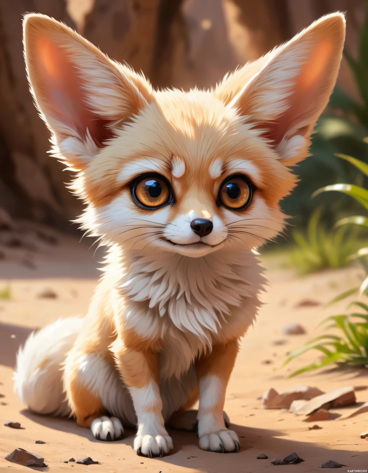 large ears and big, expressive eyes that suggest it is smiling. The
