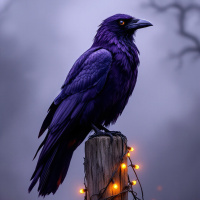 a festive occasion such as Halloween. The crow's feathers are a deep, rich purple color, contrasting with the greyish tones of