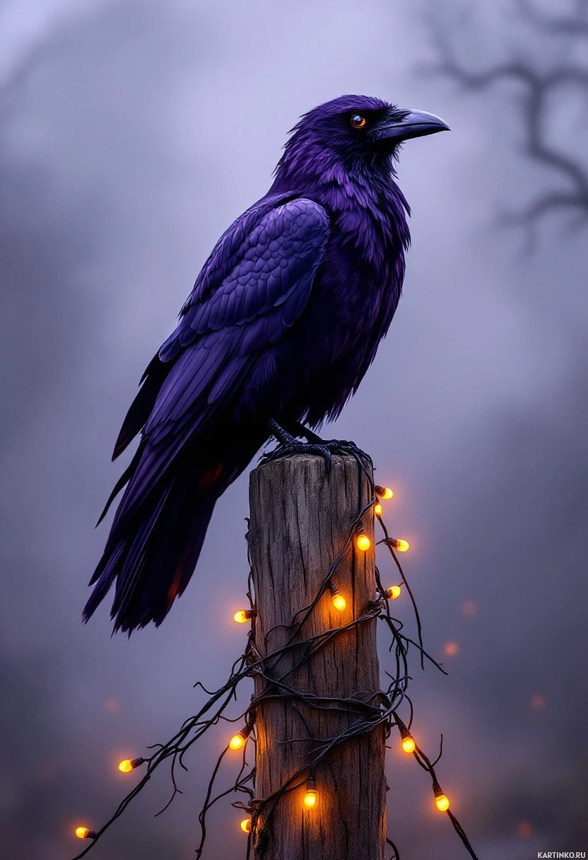 the misty background and the string of lights that resemble jack-o'-lanterns hanging in front of the bird. These lights could indicate
