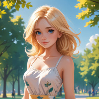 digital art or animation designs. Her expression is neutral, and she appears to be walking along a path lined with trees that have