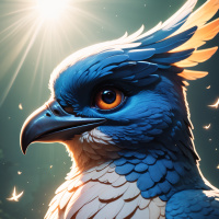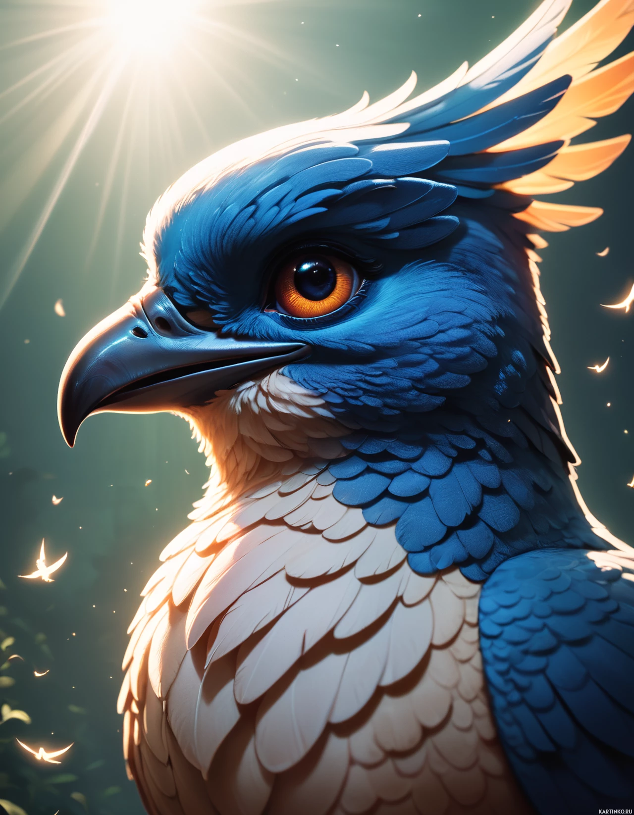 expressive eyes, a bright orange or red eye, which is not typically seen in birds. Its feathers are primarily blue with lighter shades around the wings, and there's a vivid yellow-orange hue near the eye area that could be interpreted as light reflecting off the iris or simply an artistic choice to enhance