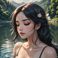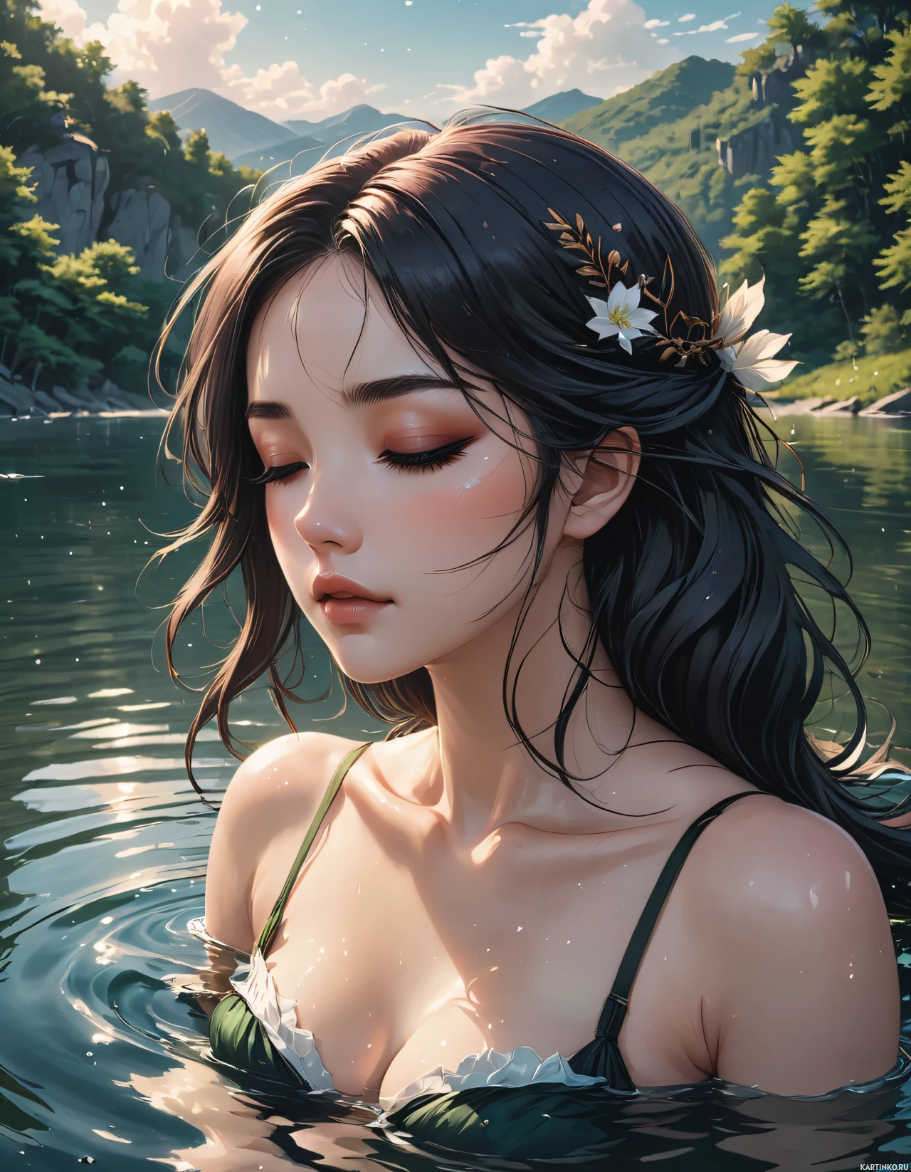 trees in the background. In front of the woman, there's water that looks like a river or pond, which she seems to be partially submerged in. The overall atmosphere of the image is serene and naturalistic, with