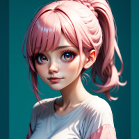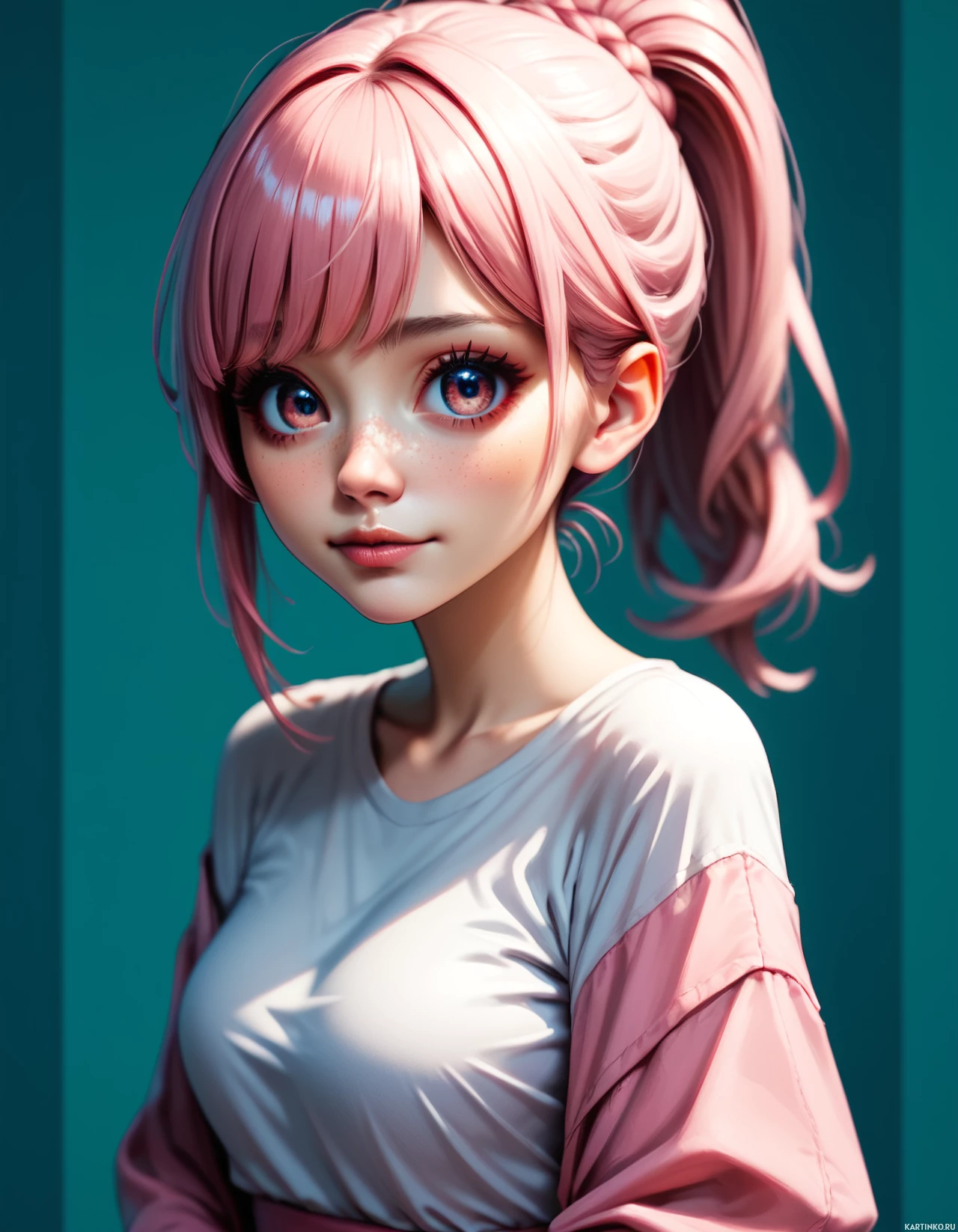 female character with pink hair tied back. She has large expressive eyes and pinkish skin, indicative of