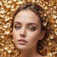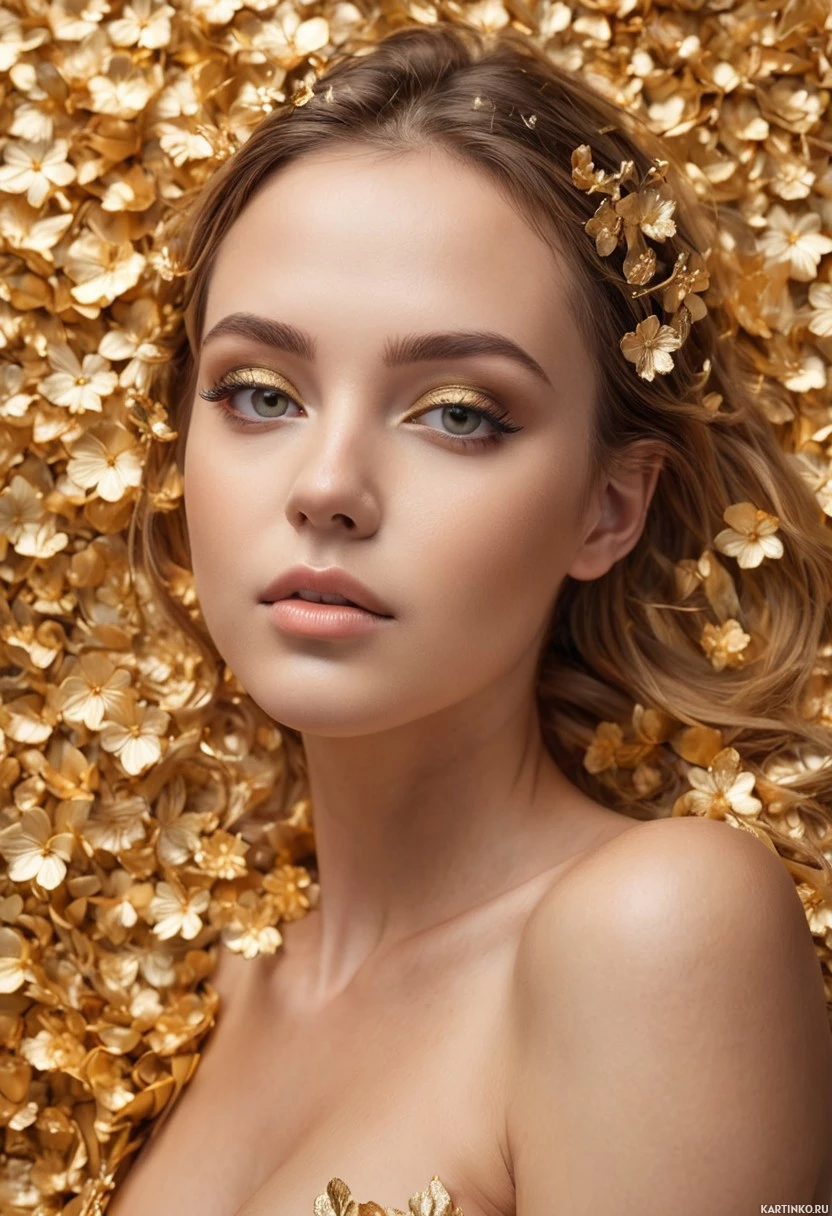a subtle smile on her face. There are golden, leaf-like petals scattered around her, suggesting a soft,