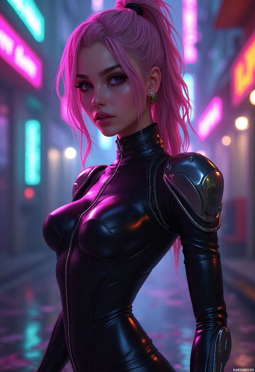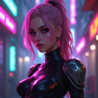 a chest piece with metallic detailing, and she's also wearing fingerless gloves. The setting suggests a neon-lit