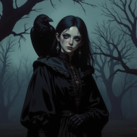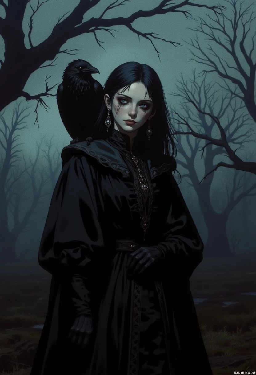 black crow is perched on her left shoulder. Her attire includes a long, flowing