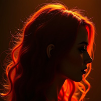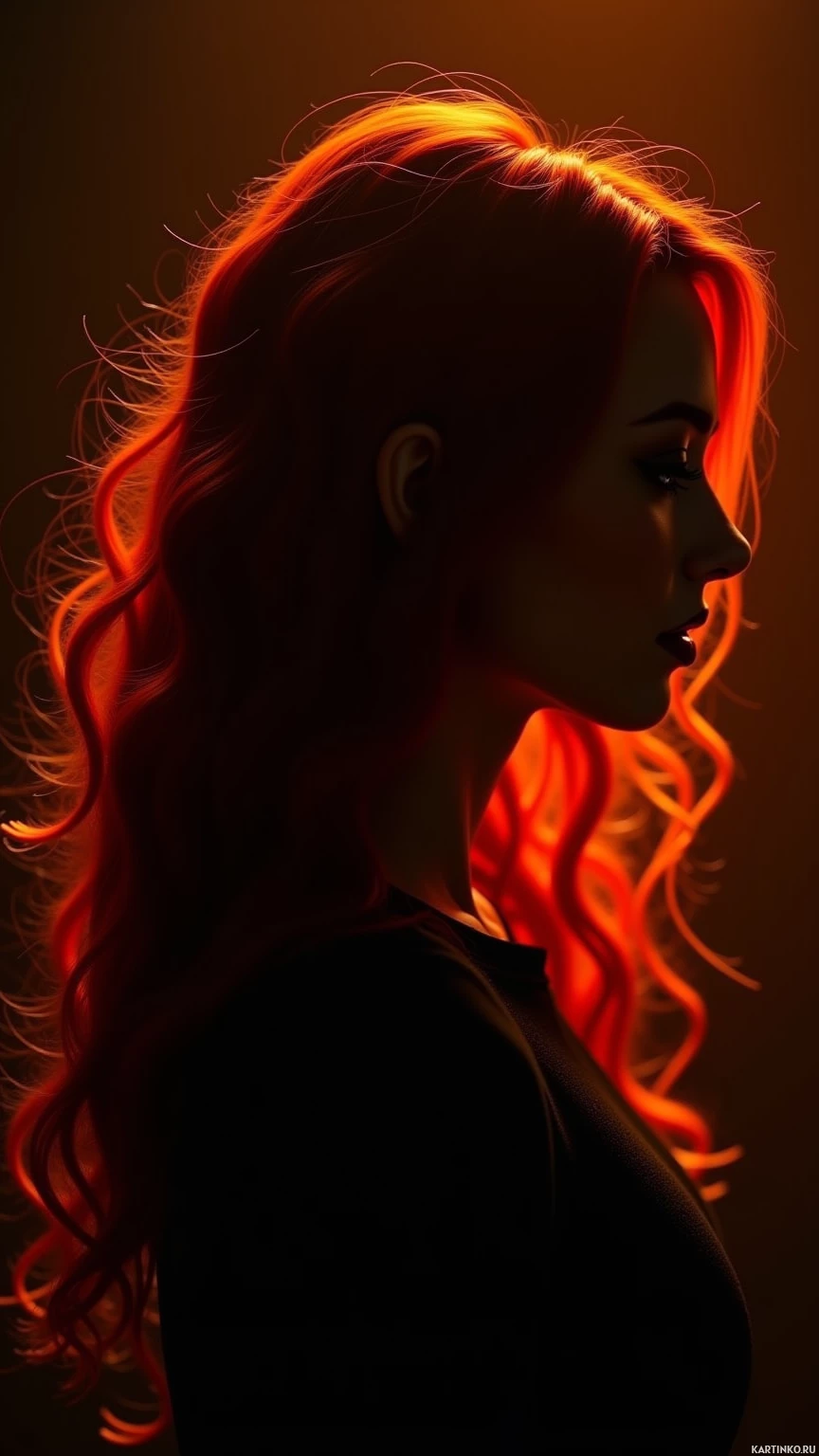 soft shadows around her face, suggesting that the lighting source is not directly on her but rather coming from an angle. The background appears to be a solid color with no distinct features, which could indicate a darker setting such as an indoor room or studio with