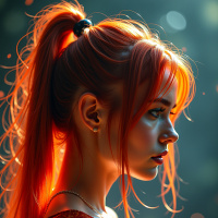 a young woman with vibrant red hair tied back in a bun. She has an intense gaze directed off to the side, giving her