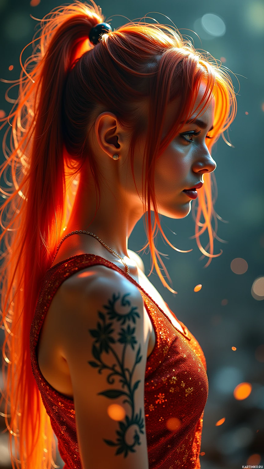 red dress that matches her hair color, which adds a striking contrast. On her arm, there's a visible tattoo, adding to her edgy and modern look. The background appears to be out of focus, but it suggests
