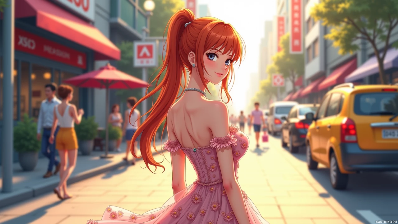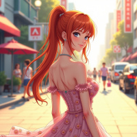 long braids that flow past her shoulders. There are multiple people walking on the street in front of shops with awning signs, including one that reads "Dunkin Donuts." The scene suggests