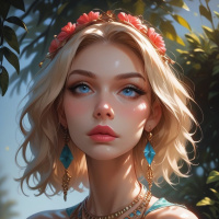 a fair complexion and is adorned with accessories such as large earrings and a necklace featuring what appears to be blue stones or gems. The style of the image suggests it could be from