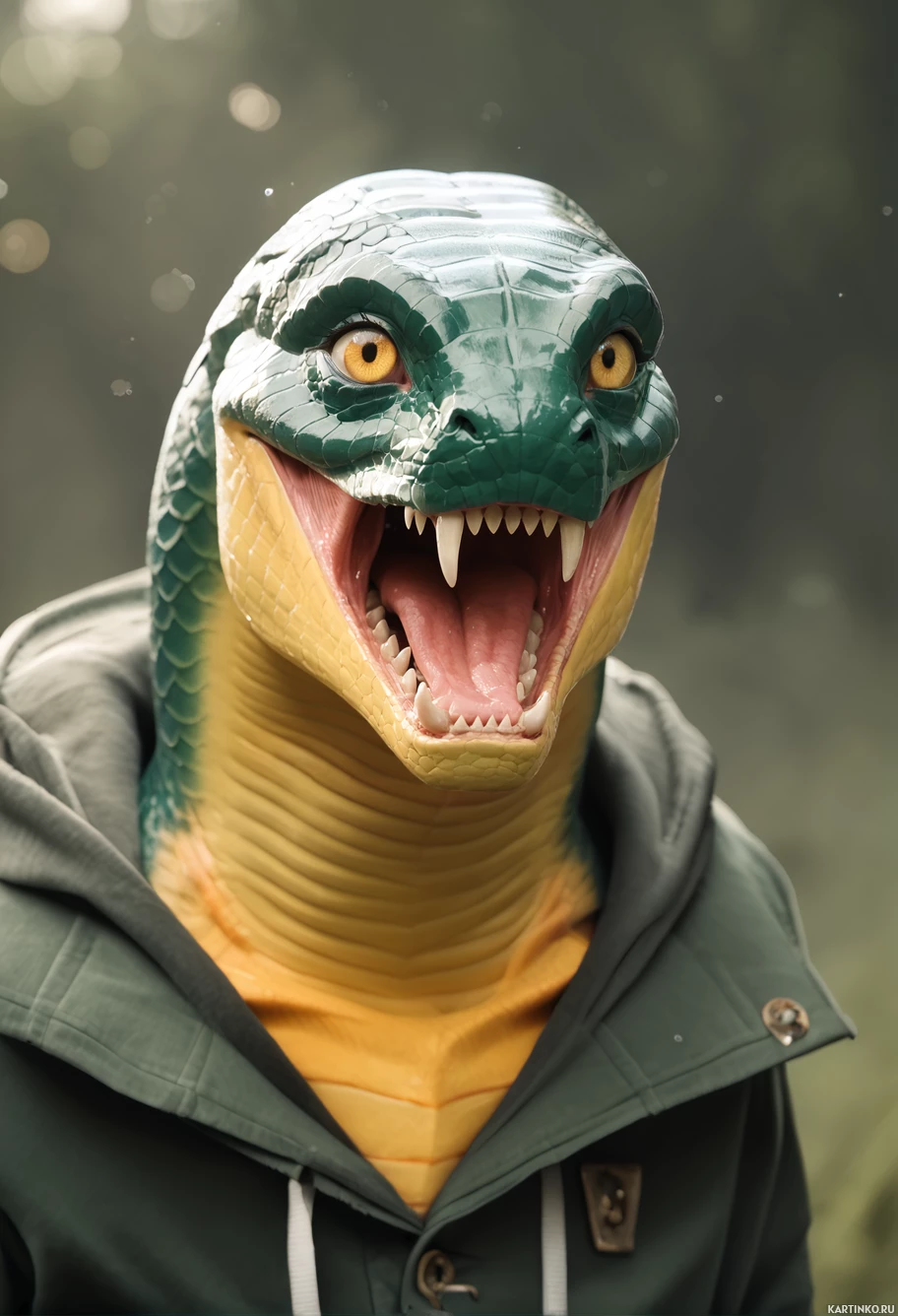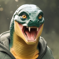In the image, there is a person wearing a full-body costume that resembles a lizard-like creature with