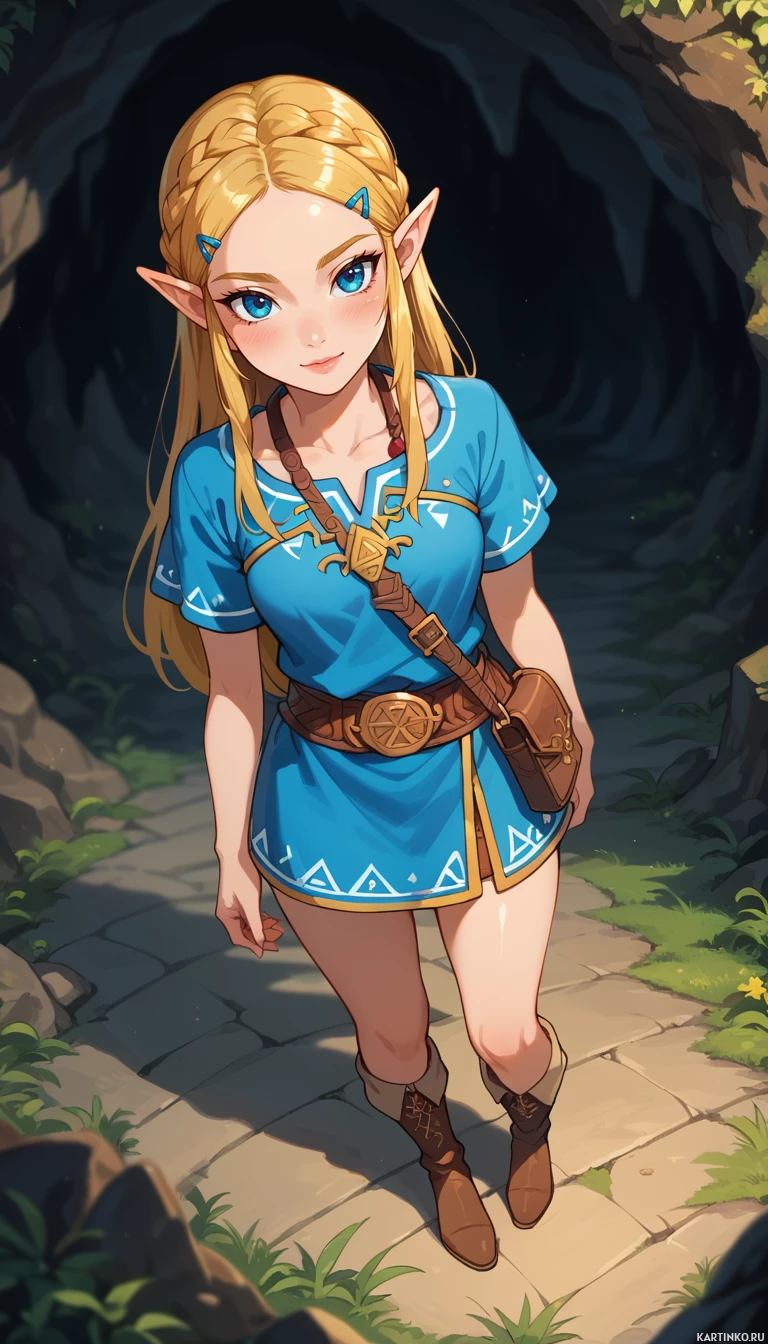 blonde hair, pointed ears, and distinctive outfit that includes blue accents on the clothing. She's wearing