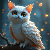 a fantastical creature resembling a cat with large, round eyes and a furry body. It has the appearance of an owl, with