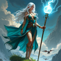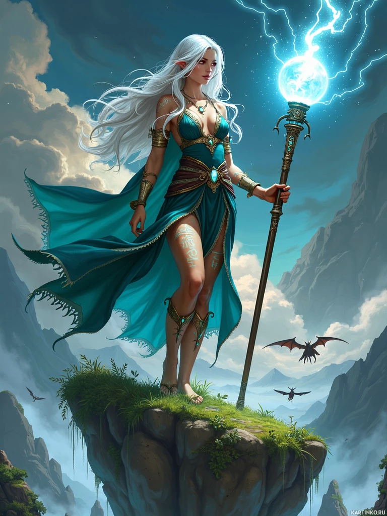 The image depicts a fantasy character, an elf with white hair, holding a staff with a lightning bolt. She is standing on the edge of a rocky outcropping that overlooks a landscape featuring mountains and what appears to be a small body of water. There are also birds in flight near her feet. The overall atmosphere suggests a scene from a high fantasy setting.