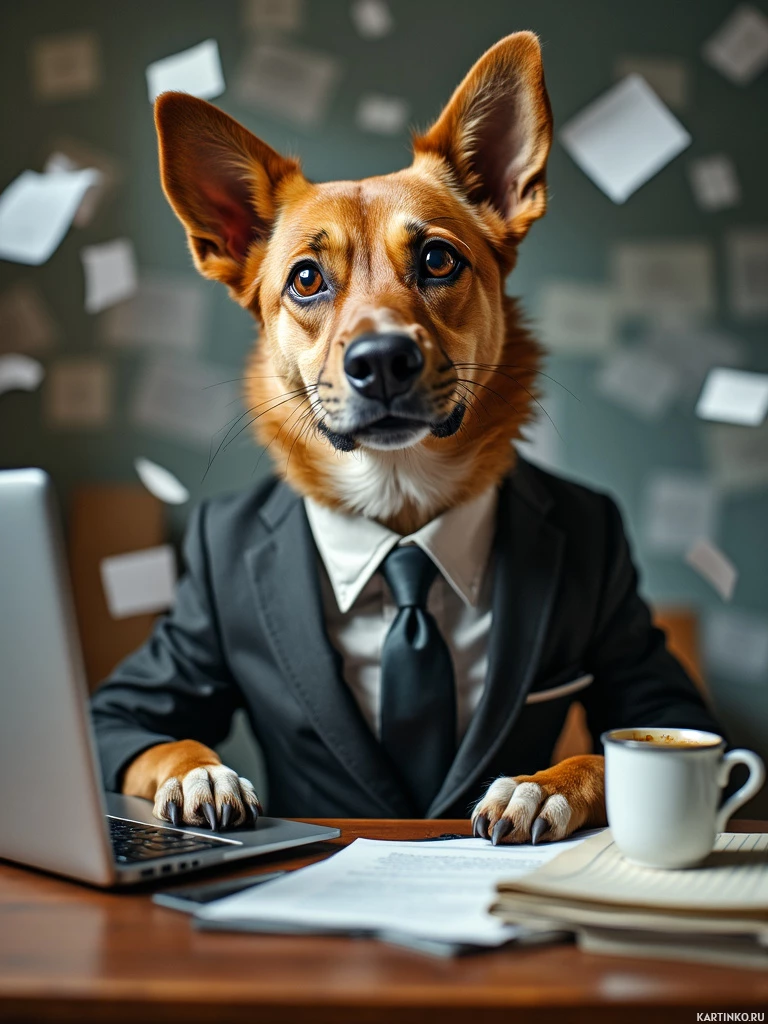 На картинке сидит коричнево-чёрный пёс с заострёнными ушами за столом. На нём тёмный костюм с галстуком и белым воротничком. Кажется, он держит лапой ручку, будто что-то подписывает или пишет. На столе открыт ноутбук с цифровым документом, как будто пёс просматривает или редактирует текст. Справа видна чашка, возможно, с кофе – частым гостем в офисах. В целом, картинка создаёт забавный и антропоморфный образ рабочего места, где пёс выполняет человеческие задачи.