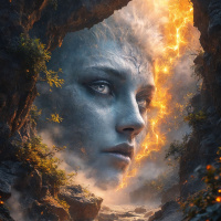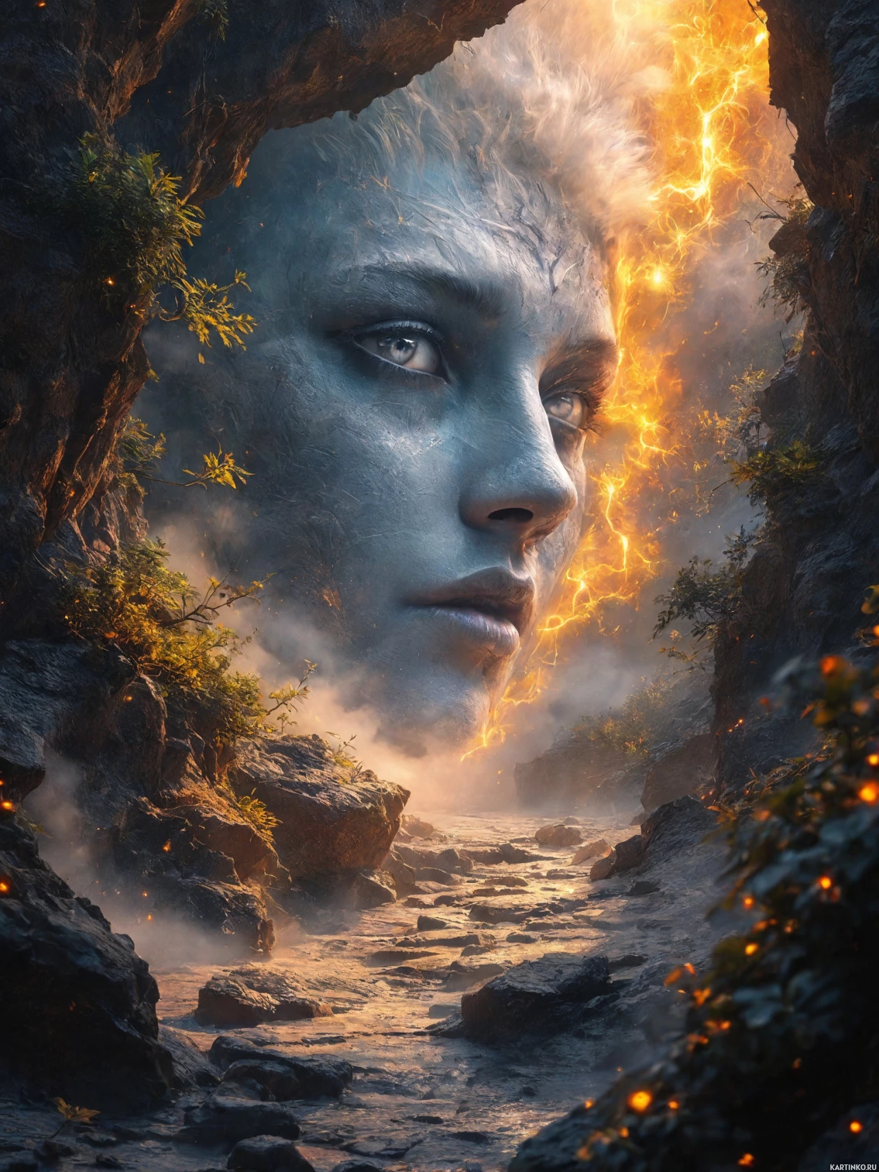 a specific character or culture within the narrative of the image. The woman's face is framed by rocks and natural elements, giving the impression that she is emerging from them like