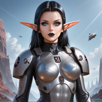 a female character depicted in a futuristic armor. She has pointed ears that suggest an elven or fantasy element to her design. The armor is sleek and shiny with what appears to be intricate details on it, possibly signifying