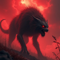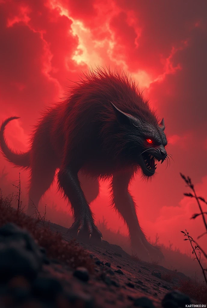 red eyes and sharp teeth, conveying a sense of danger and supernatural menace. Its fur is predominantly black with hints of brown, and its posture suggests aggression or readiness for battle. The