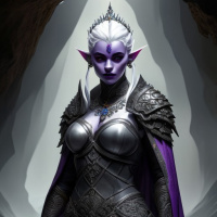 a stern expression on her face and is looking directly at the viewer. In her right hand, she holds a small knife with a simple design, hinting at combat readiness. The style of the image suggests it could be from a fantasy role-playing game or a piece of concept art for a fantasy story or game. The overall tone of the image is dark and moody, fitting the typically underground environments associated with drow characters in fantasy settings.