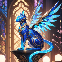 The image depicts an anthropomorphic cat with wings, perched atop a pillar within a grand Gothic cathedral. The cat is adorned with intricate armor and accessories, including a helmet and amulet, suggesting it might be a character of significance in a fantasy or mythical context. The overall impression is one of majesty and mystique.