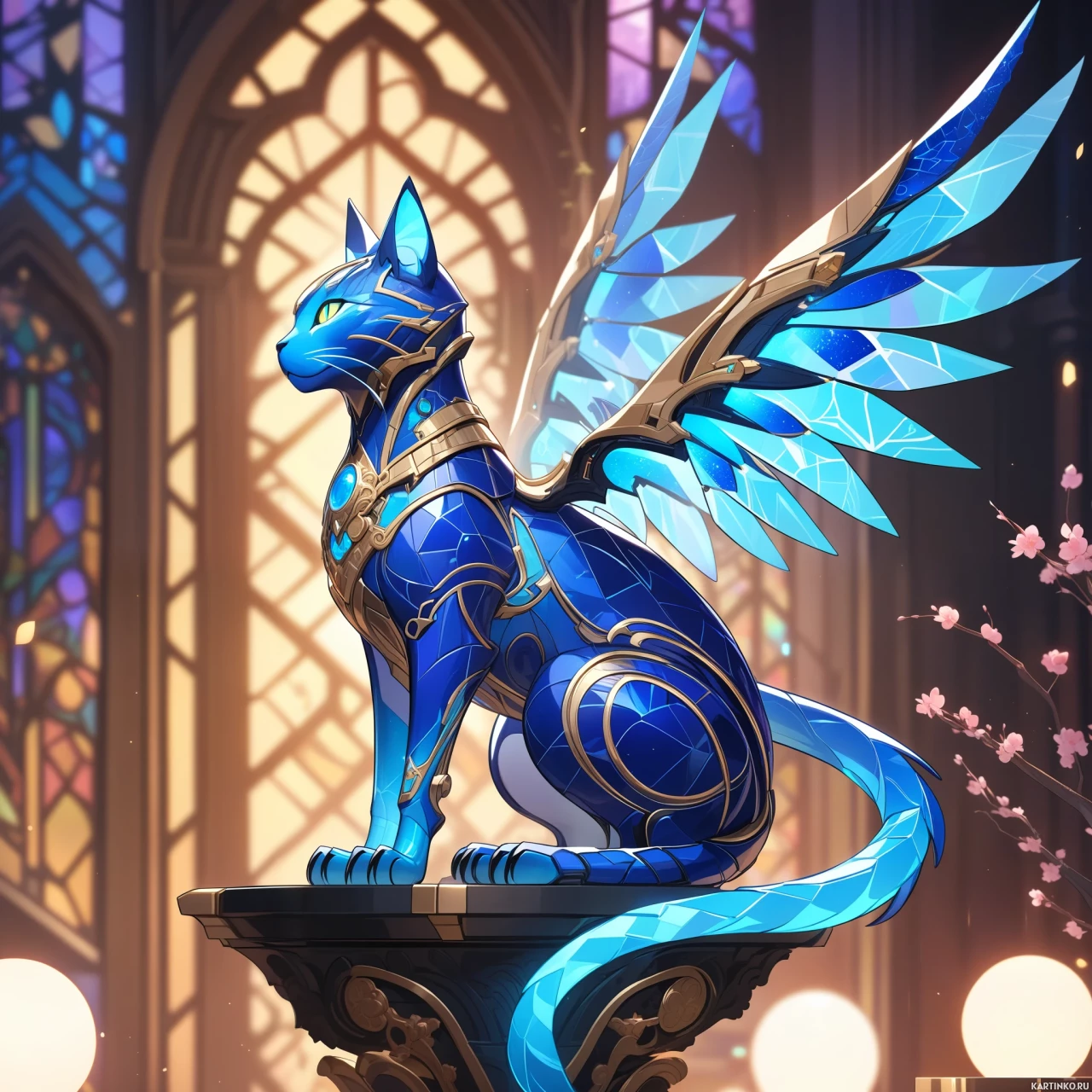 Картинка изображает антропоморфного кота с крыльями, восседающего на колонне внутри величественного готического собора. Кот украшен сложной броней и аксессуарами, включая шлем и амулет, что намекает на его значимость в фэнтезийном или мифологическом контексте. Общее впечатление – величие и таинственность.