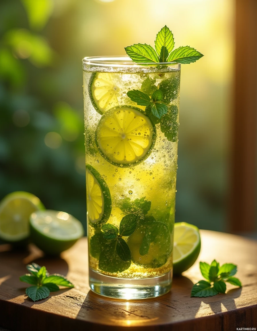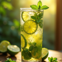 a refreshing beverage, which appears to be a lemonade or soda with lemon and mint flavorings. It is garnished with freshly sliced