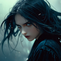 blue eyes and is depicted with a serious expression on her face. The character is wearing a black outfit that gives off a gothic or fantasy vibe, which could suggest a character from
