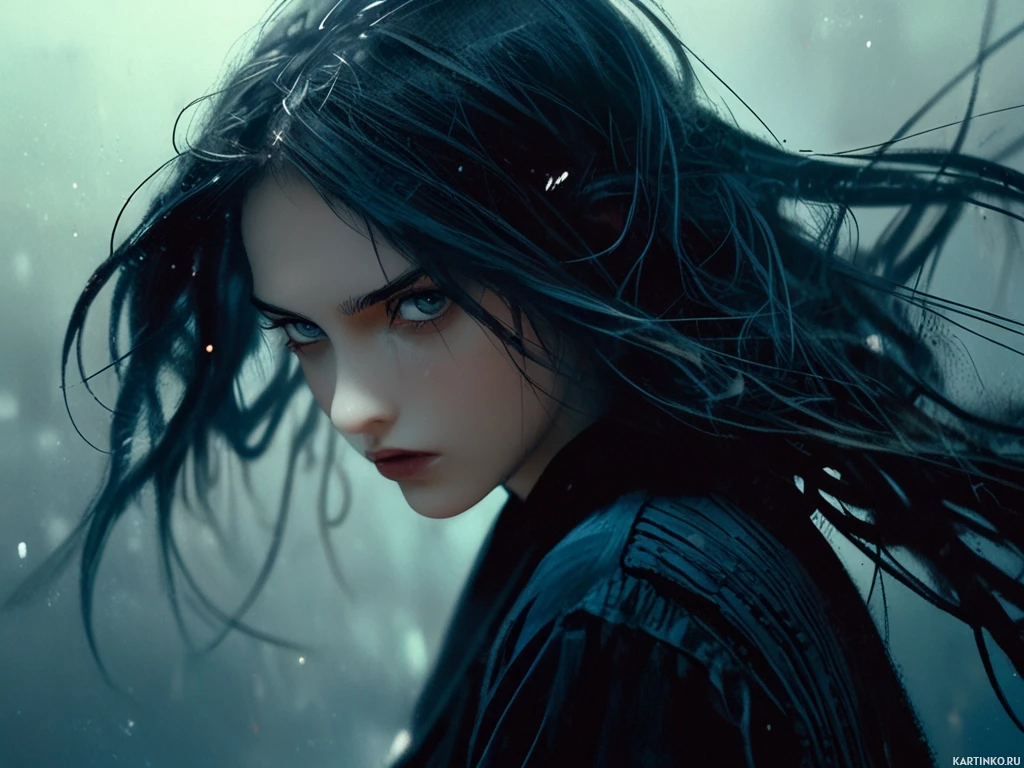 realistic portrayal of the character's face and hair detail, while the background has more stylized elements that contribute to an ethereal or otherworldly feel.
