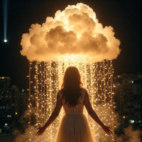 The image depicts a woman standing behind an illusion of a cloud. She is dressed in what appears to be