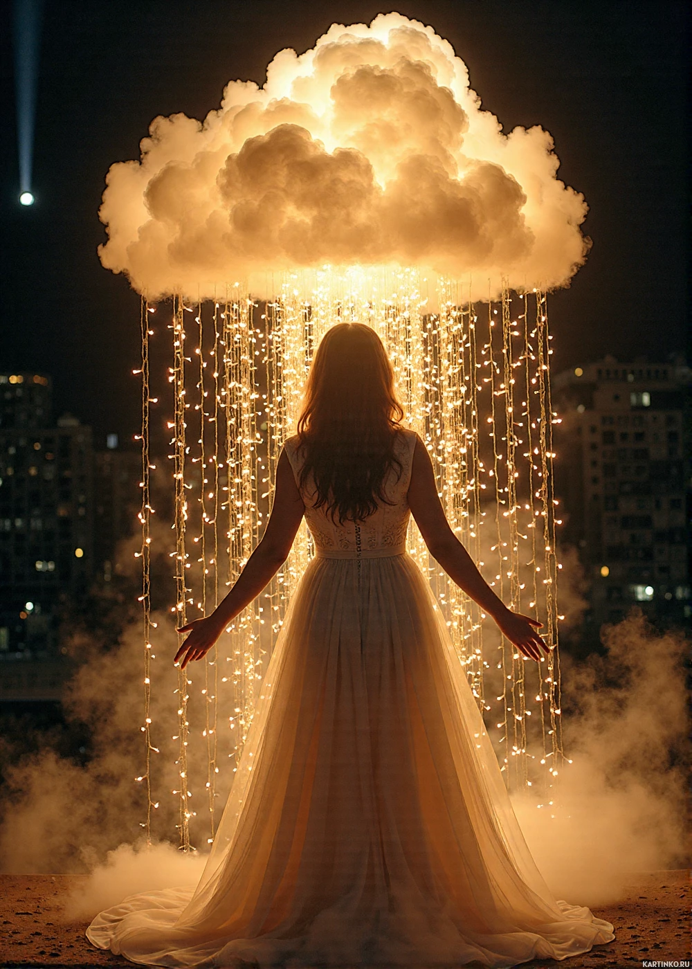 an urban setting at night. There is also steam rising from beneath her feet, adding to the magical and dreamlike quality of the scene.