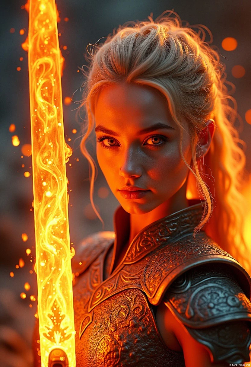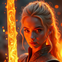 facial expression is serious, with a hint of defiance, which complements the overall posture. In one hand, they hold a sword that has a red-