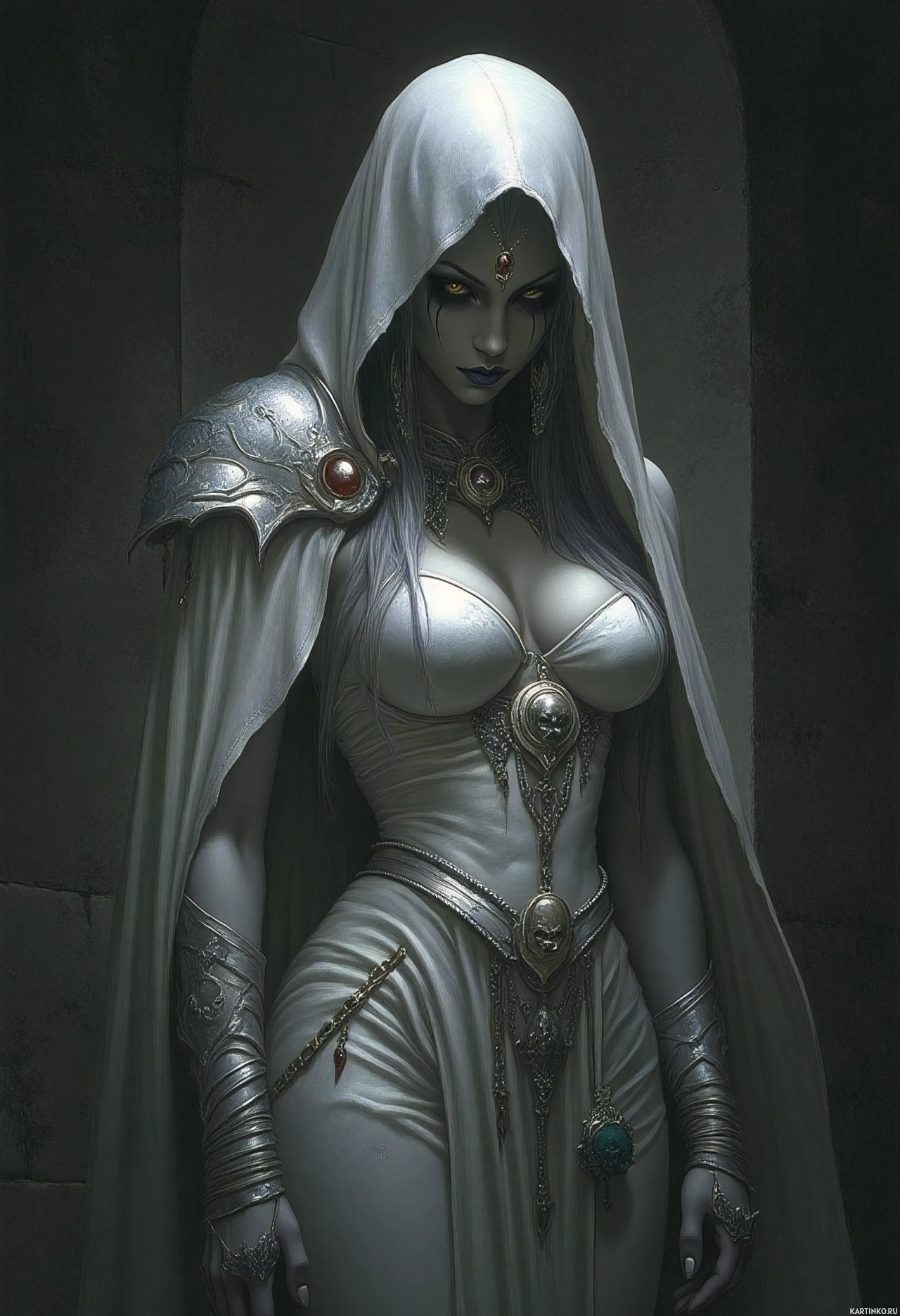 long hair and is also adorned with jewelry, including what appears to be a large gem on her chest. Her expression is serious and contemplative. She is set against a backdrop that seems to be an archway or entrance into a dimly lit area, which adds to