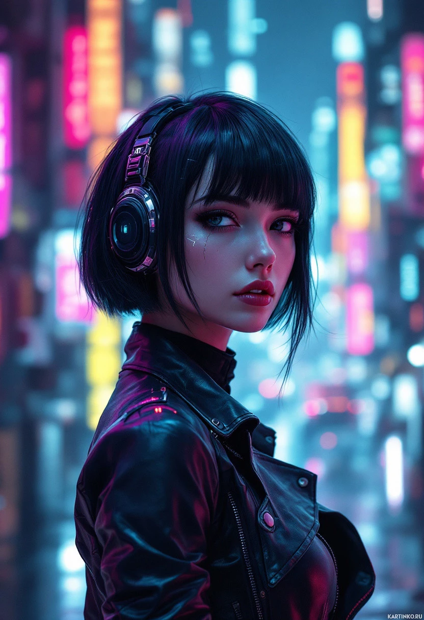 leather jacket over what appears to be a light-colored top or shirt. In the background, there are illuminated signs and advertisements that suggest she might be in a bustling urban area, possibly Tokyo, given the design style which is reminiscent of