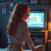 red hair, sitting on a bed. The individual is wearing panties and appears to be focused on something outside the frame of the picture. There is a TV in front of them, but it's not turned on, suggesting they might be engaged in an activity that doesn't involve watching television, such as playing