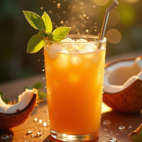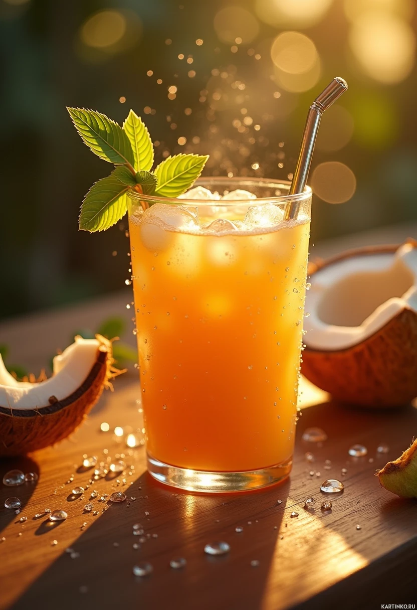 Высокий стакан с ледяным напитком, украшенный кокосовой стружкой и веточкой мяты, стоит на деревянной поверхности. Рядом лежат два кокоса, один из которых разрезан сверху, обнажая белую мякоть. Вокруг кокосов – рассыпанная стружка. На заднем плане размытый пейзаж, создающий ощущение дневного света и теплых тонов.