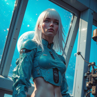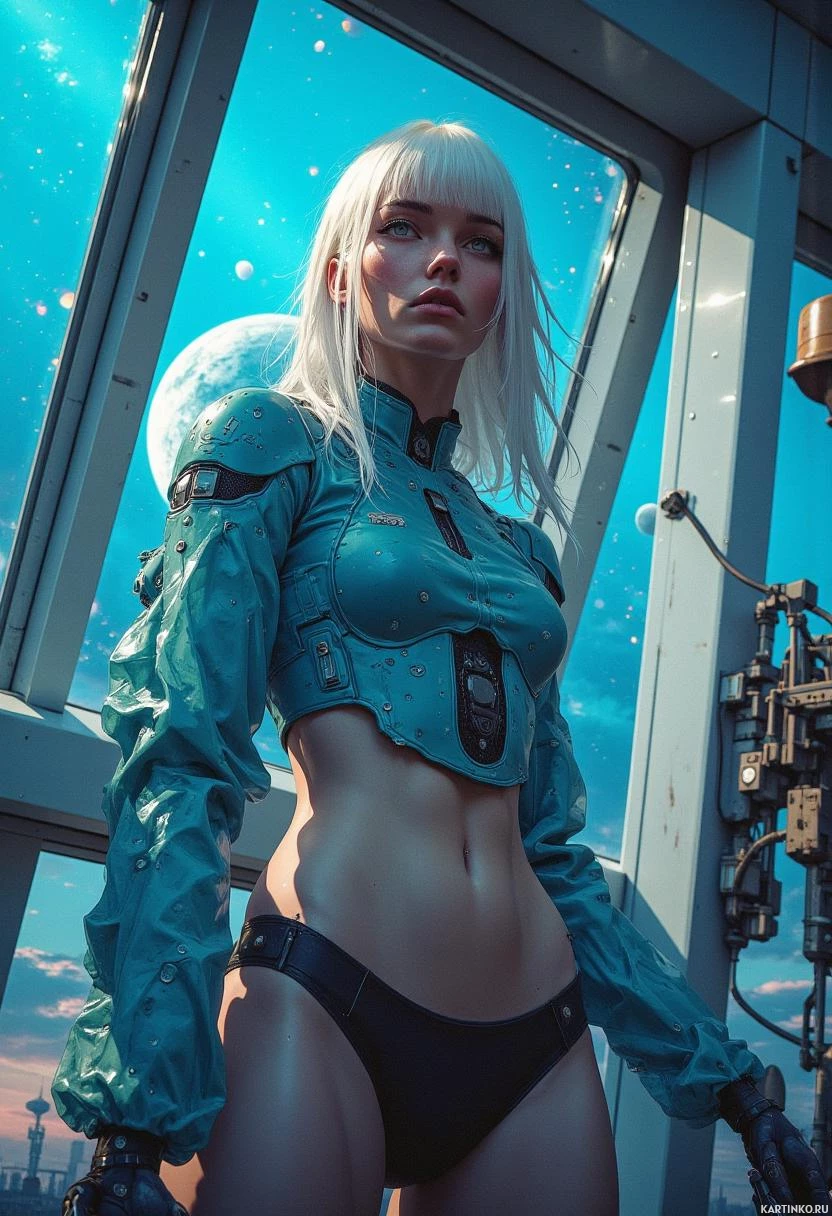 white hair standing inside what appears to be the control room of a spacecraft. They are wearing a futuristic, form-