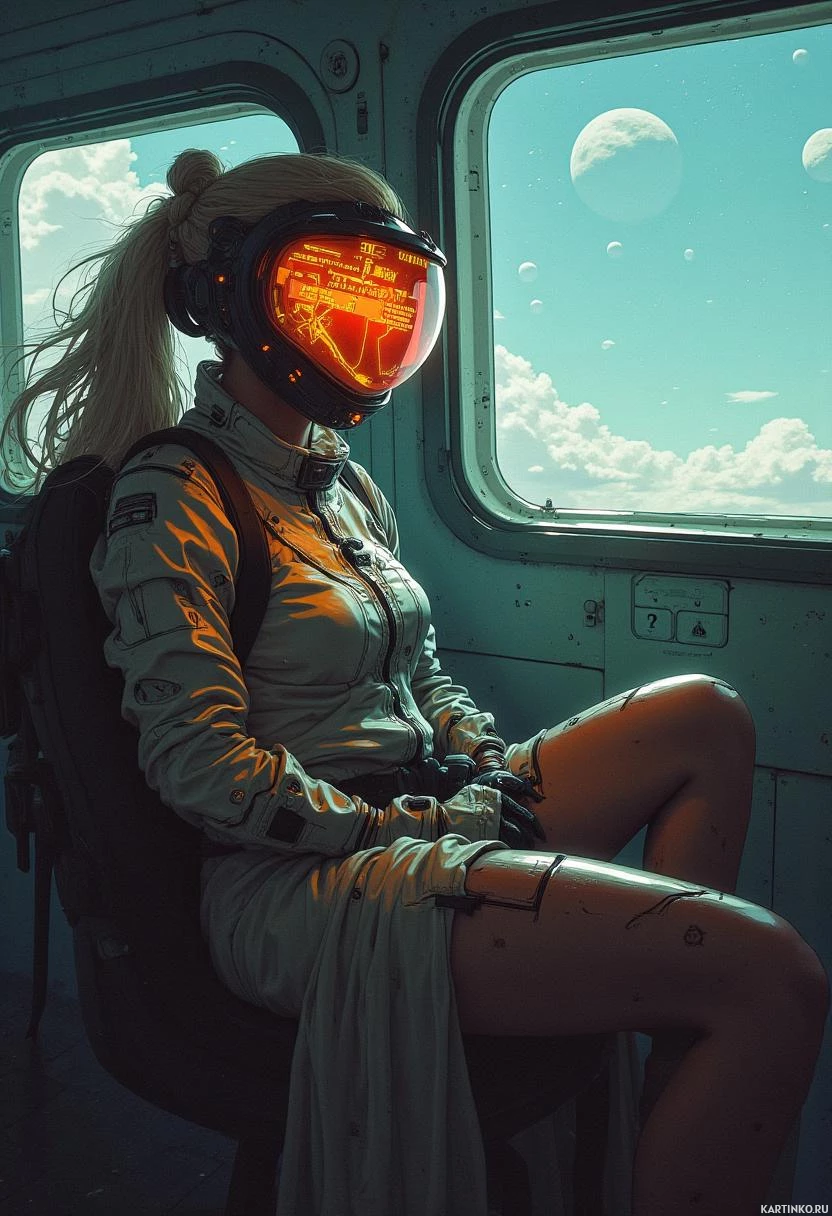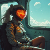 flight suit and a helmet with a visor, which suggests she might be preparing for a mission or journey. In the background, there's an open door through which one can see a clear