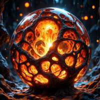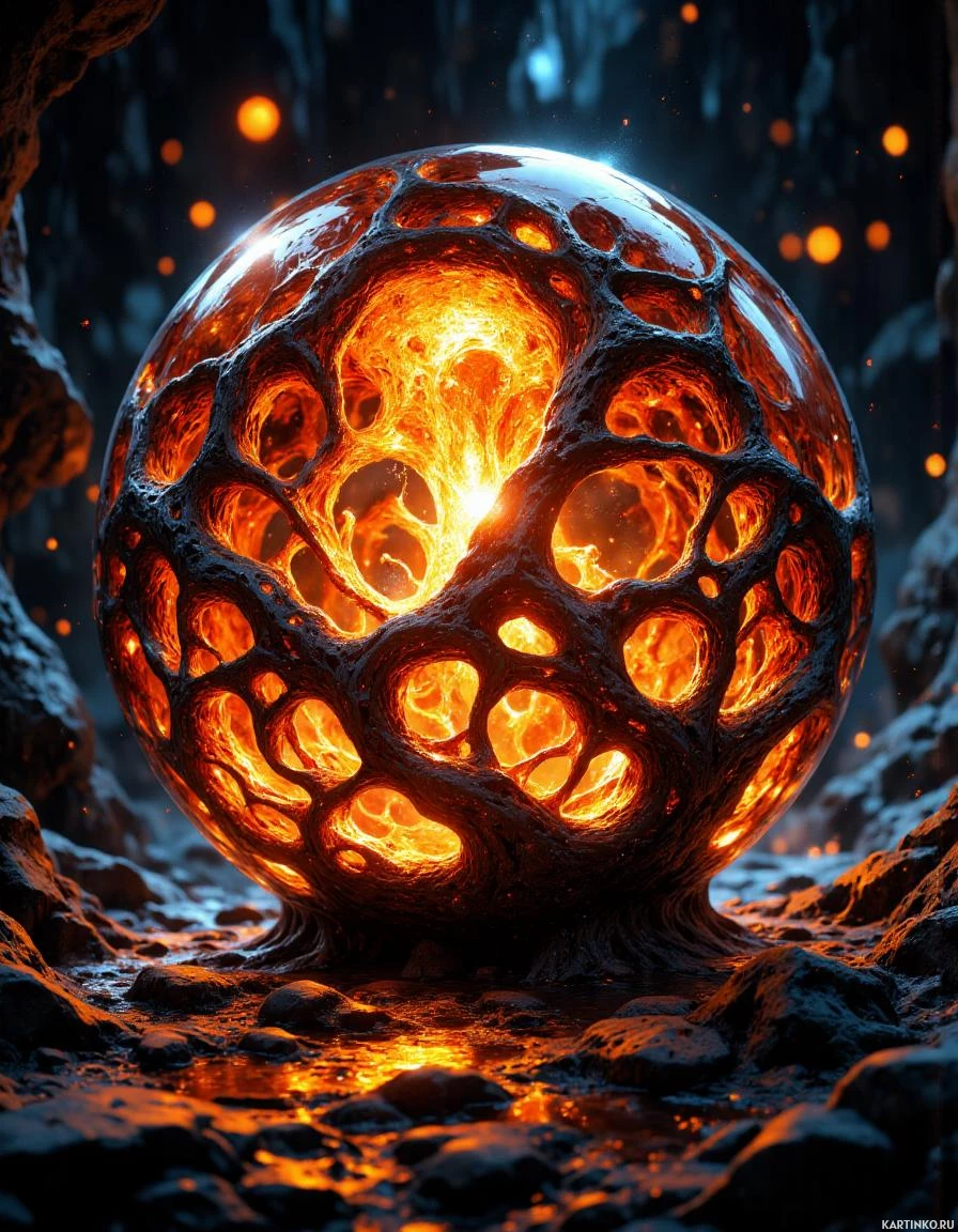 rock formations that resemble a globe, complete with a central opening and multiple chambers or channels that release and reabsorb the molten rock in a slow, mesmerizing process, mimicking the effect of traditional lava lamps. The scene appears to be set in a dark,