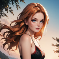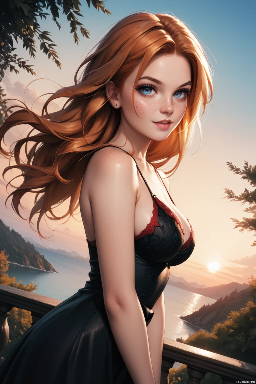 a black dress with an off-the-shoulder design, revealing part of her chest. Her expression is one of contemplation or seriousness as she gazes to the side, not directly at the viewer. The background depicts a serene landscape during what appears to be sunset or sunrise, with