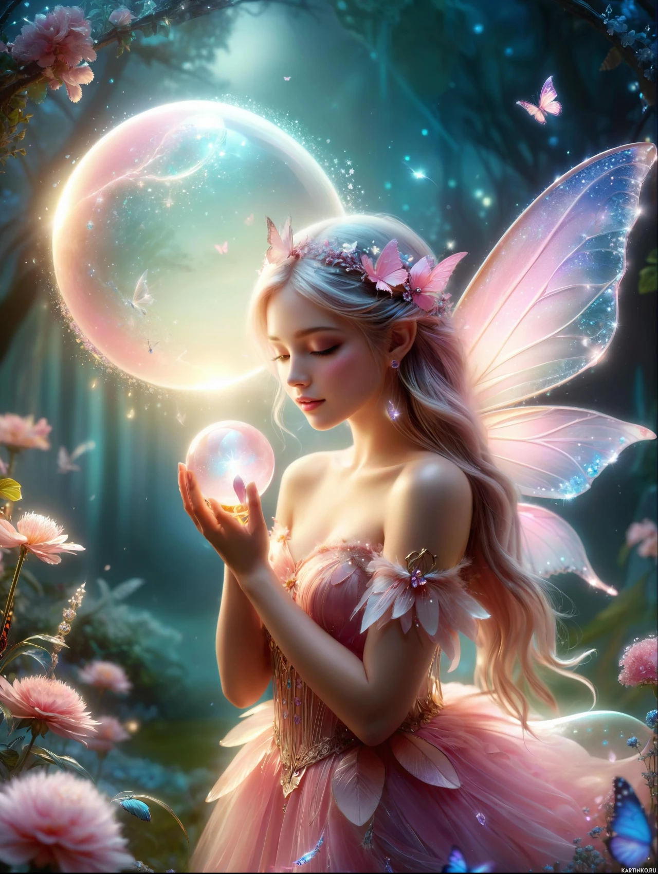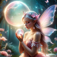 The image depicts a fantasy-themed scene featuring a female character with closed eyes and white hair, adorned in a fairy costume. She holds a transparent sphere that emits a sparkling effect and is surrounded by magical elements such as floating bubbles and glowing flowers.