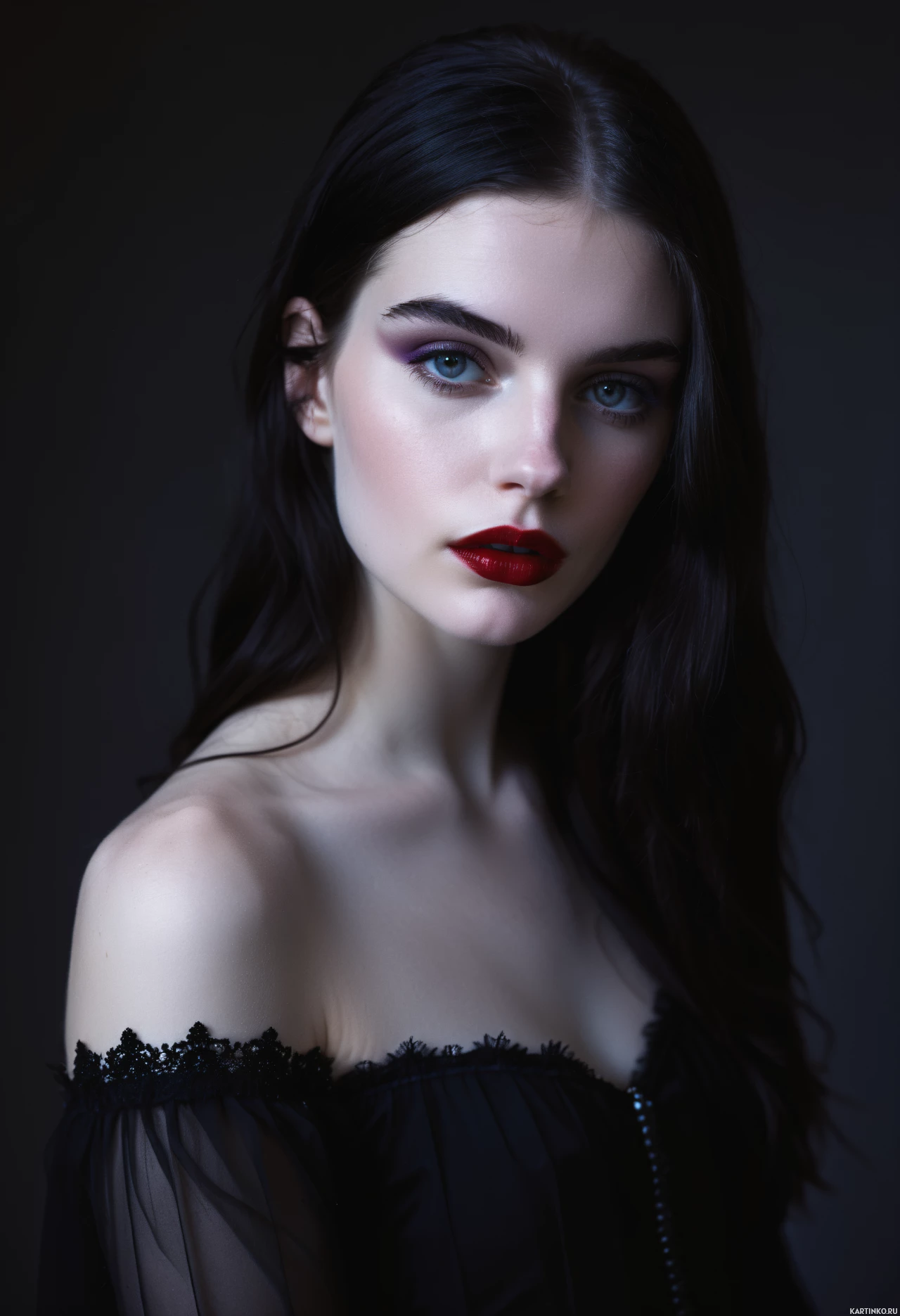 red lipstick and has what appears to be purple accents around her eyes. Her attire consists of a black, off-the-shoulder garment with lace elements, which suggests a gothic or edgy style influence. The woman's gaze is directed straight at the camera, giving a sense of
