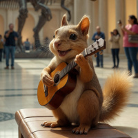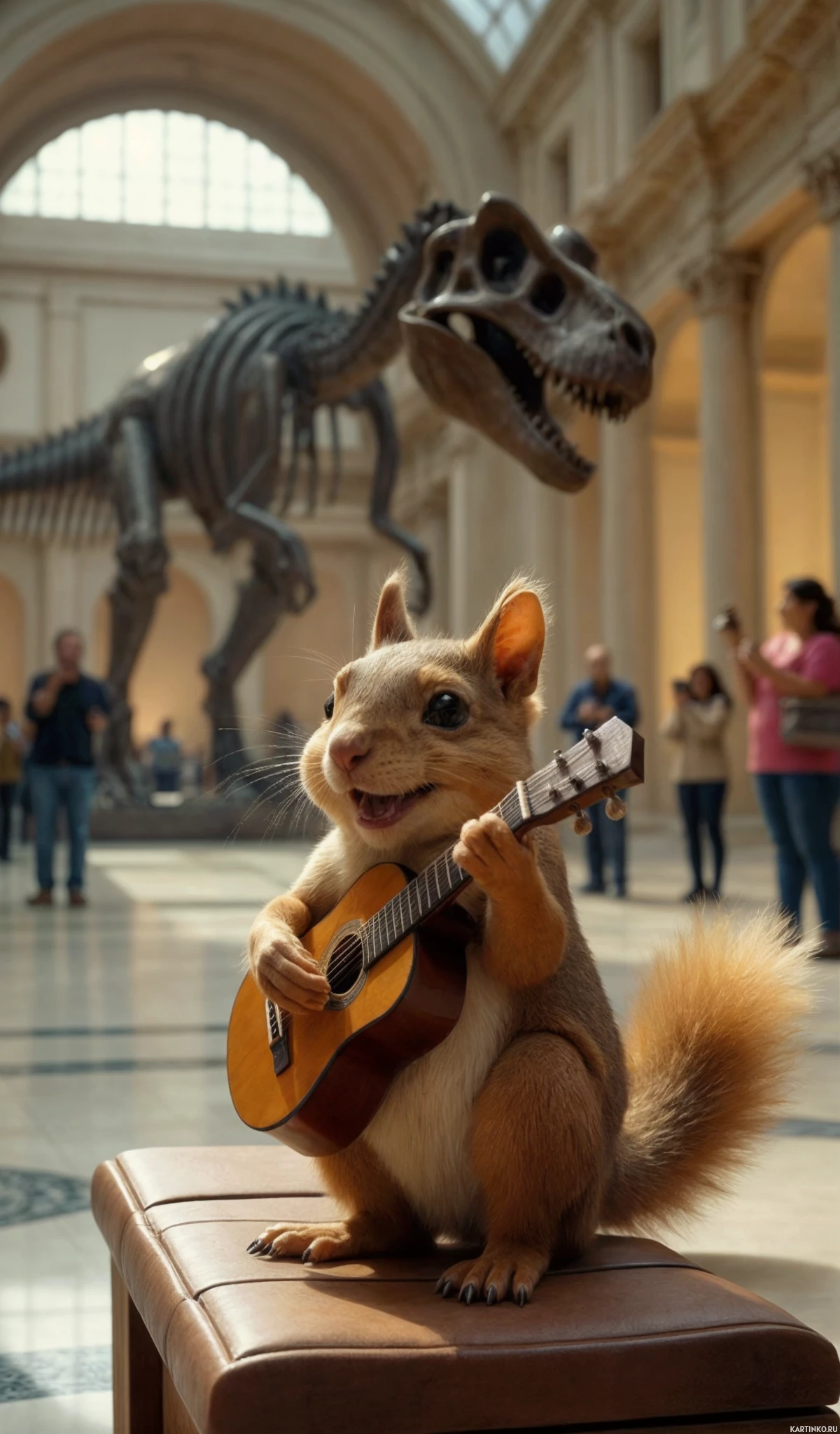 a small squirrel sitting on a stool, holding a miniature guitar. The squirrel appears to be playing the guitar, with its paws positioned as if strumming or picking at the strings. The setting seems to be indoors, possibly in an exhibition hall given the presence of