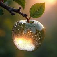 The image features a close-up of an apple hanging from the tree, bathed in sunlight that creates