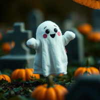 The image shows a Halloween-themed setting with pumpkins. In the foreground, there is a figure that appears to be a friendly ghost, characterized by white skin, dark