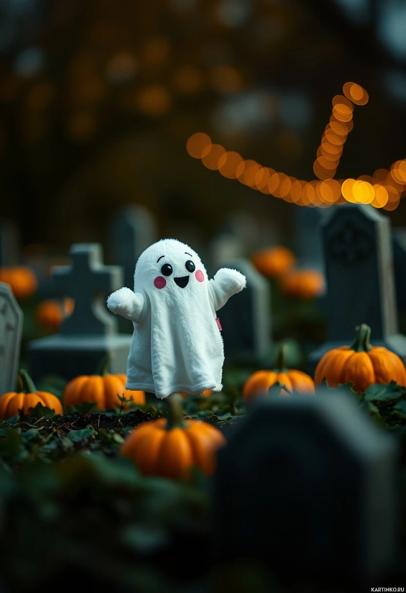 black dots representing eyes. Behind the ghost, there are gravestones with names engraved, suggesting this is a cemetery. In the background, there's an out-of-focus image of what looks like a fence or a row of trees, which adds depth to the scene. There is also a string of lights that run along the top of the image, contributing to the festive ambiance typical for