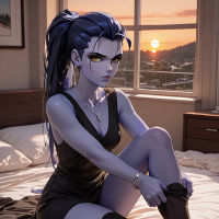 an intense gaze. There's a hint of sunset visible through the window behind her, suggesting that the setting might be during evening or dusk. The scene appears to be staged as a photo-realistic illustration, which is common in