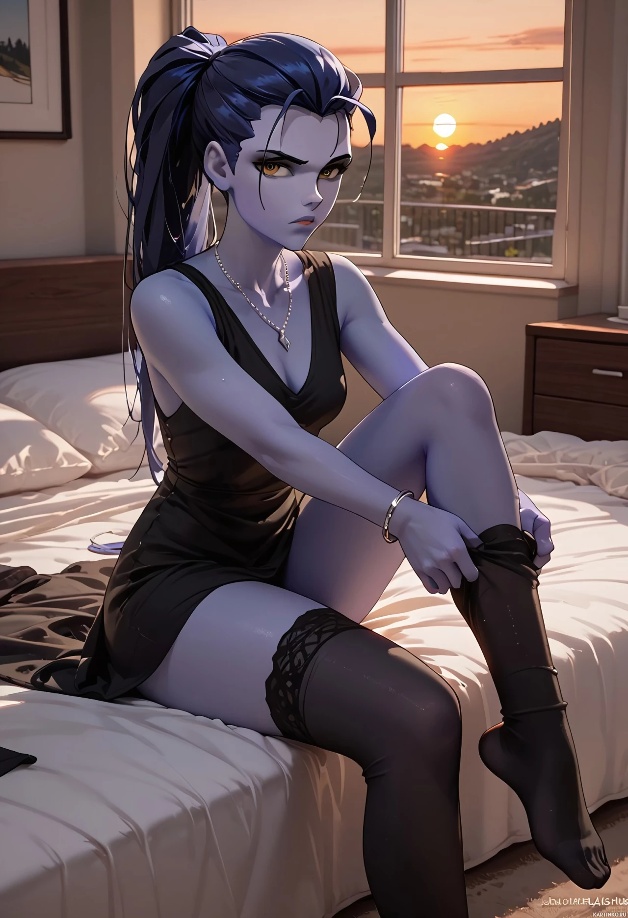 silver hair and is wearing black lingerie, complete with thigh-high stockings. The character is seated on the edge of a bed with her legs crossed, looking directly at the viewer with