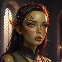 fantasy attire. Around her head, there are feathers or plumes that add to the fantastical appearance. The background is simple, featuring what appears to be an old stone structure, possibly ruins, enhancing
